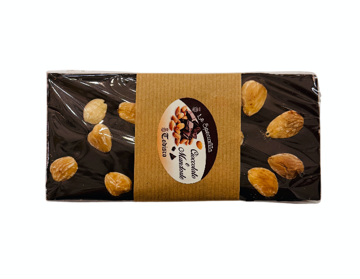 Cocoa mass, sugar, cocoa butter, emulsifier: soy lecithin with toasted almonds (20%).