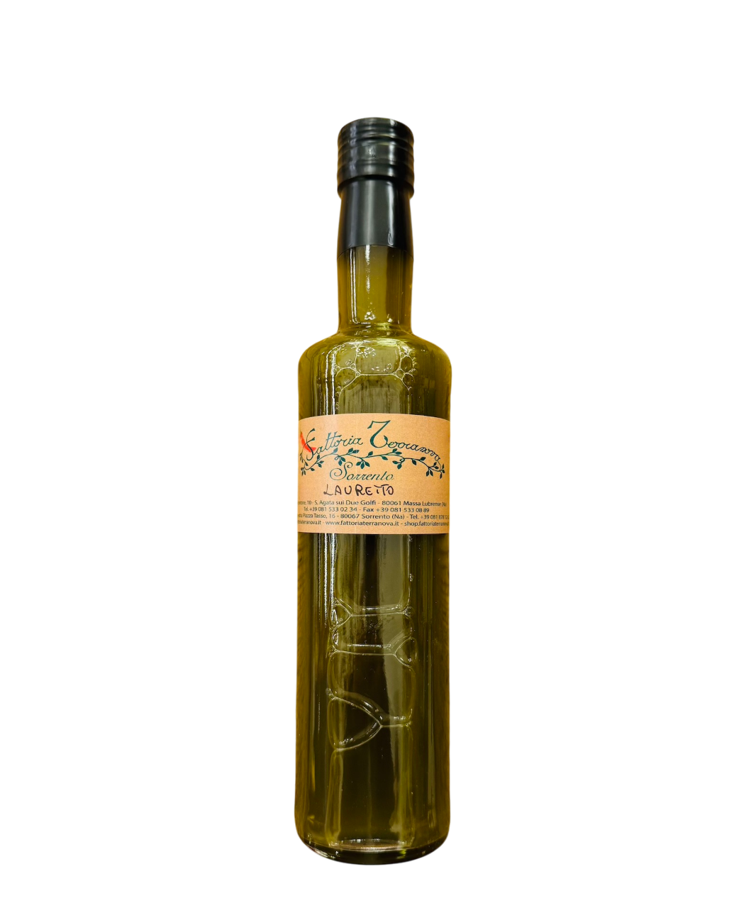 Homemade Laurel (Alloro) liqueur produced and bottled in Sorrento by Fattoria Terranova.
