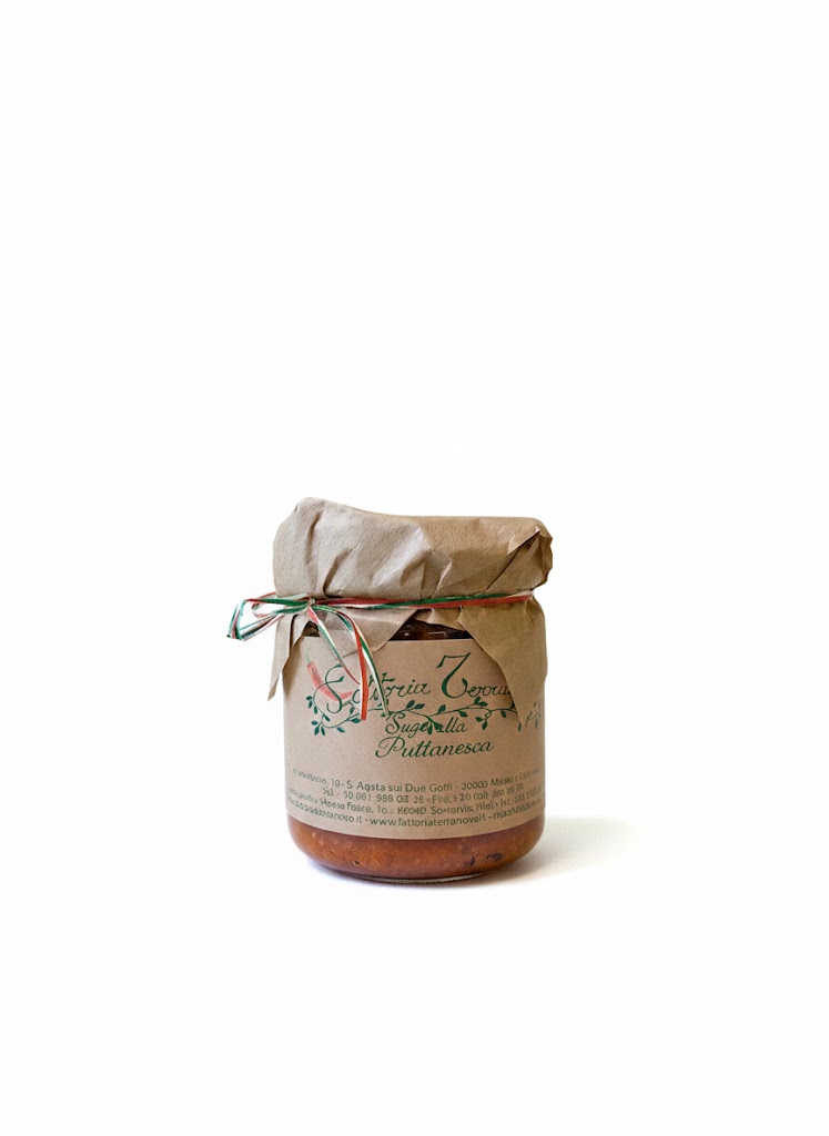 Ingredients: tomato sauce (Italy), black olives, extra virgin olive oil, capers, anchovies, chilli, parsley, salt.